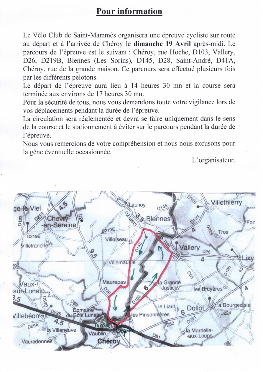 Une course cycliste aura lieu ce dimanche 19 avril de 14h30 à 17h30 environ et traversera Vallery. A cette occasion, les rues de Paris et de la Libération seront en sens unique dans le sens de la course, et gérée par l’équipe du vélo club de Saint-Mammès. Des déviations seront mises en place. Merci de votre compréhension et de votre vigilance.